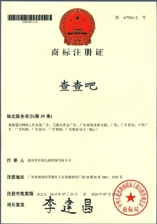 2010年7月查查吧正式通过了商标注册,获得了查查吧使用商标名称和商标图标。